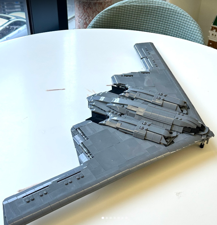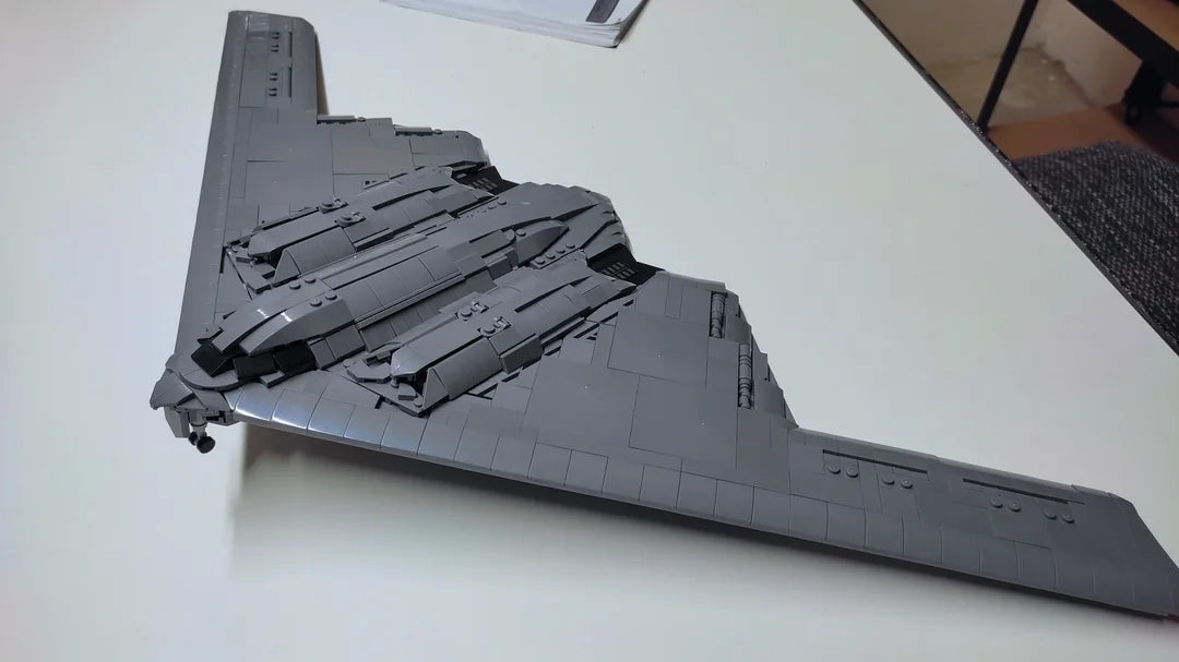 A brick-built display model inspired by the B-2 Strategic Bomber, capturing its iconic flying-wing silhouette, stealth-focused geometry, and imposing presence rooted in advanced aerospace engineering.